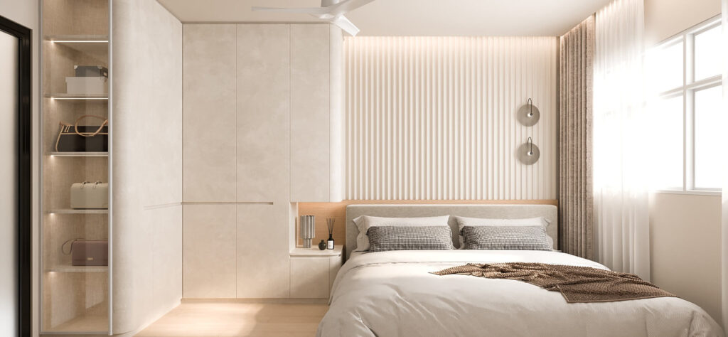 In the master bedroom, a cream-and-beige palette paired with maple-brown flooring provides gentle warmth. The curved details on the built-in side tables and bedframe introduce a subtle softness. Layered curtains add to the room’s quiet, hotel-like composure. Cove lighting tucked into the curtain pelmet and warm downlights bring a comforting glow to the overall atmosphere.