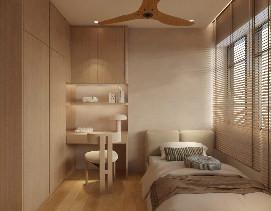 In this family’s home, an ivory backdrop across the ceilings and walls in the living and dining area forms a clean, continuous foundation. Oak laminate accents on the countertops, cabinetry, and engineered wood flooring introduce warmth, carrying a consistent visual language through the living area, kitchen, bedroom, and corridors — a cohesive direction for modern HDB interior design & renovation ideas.